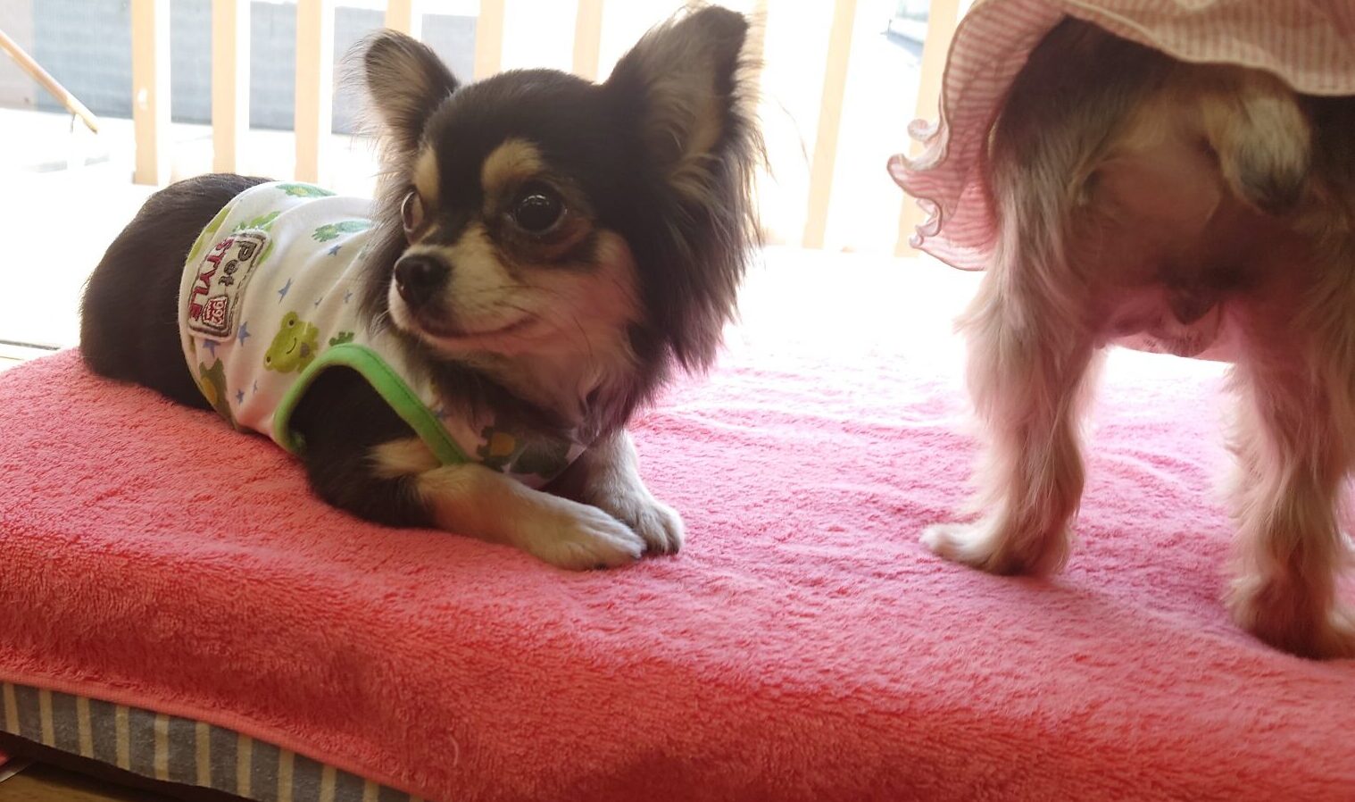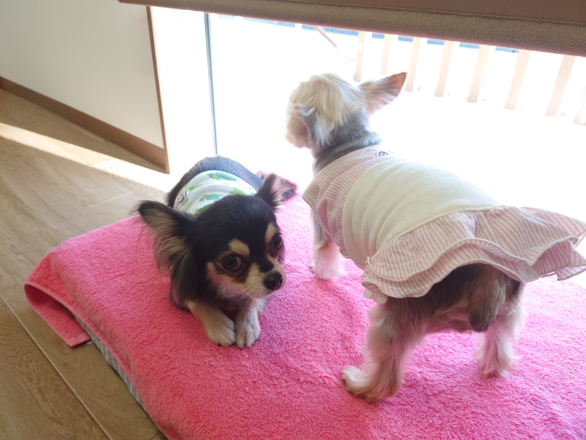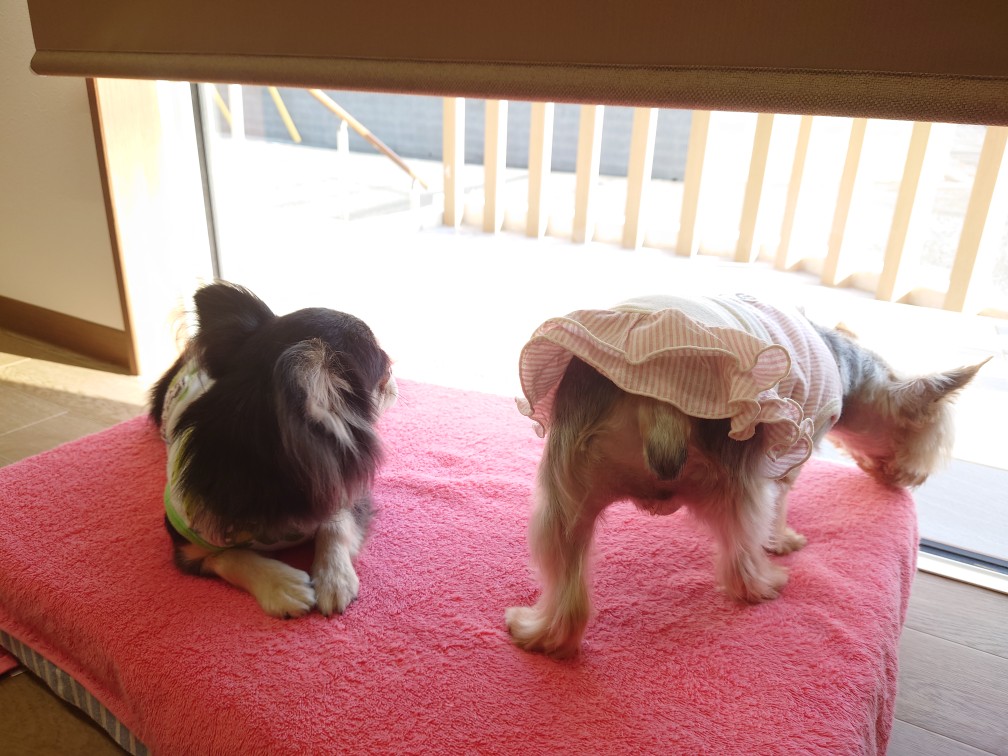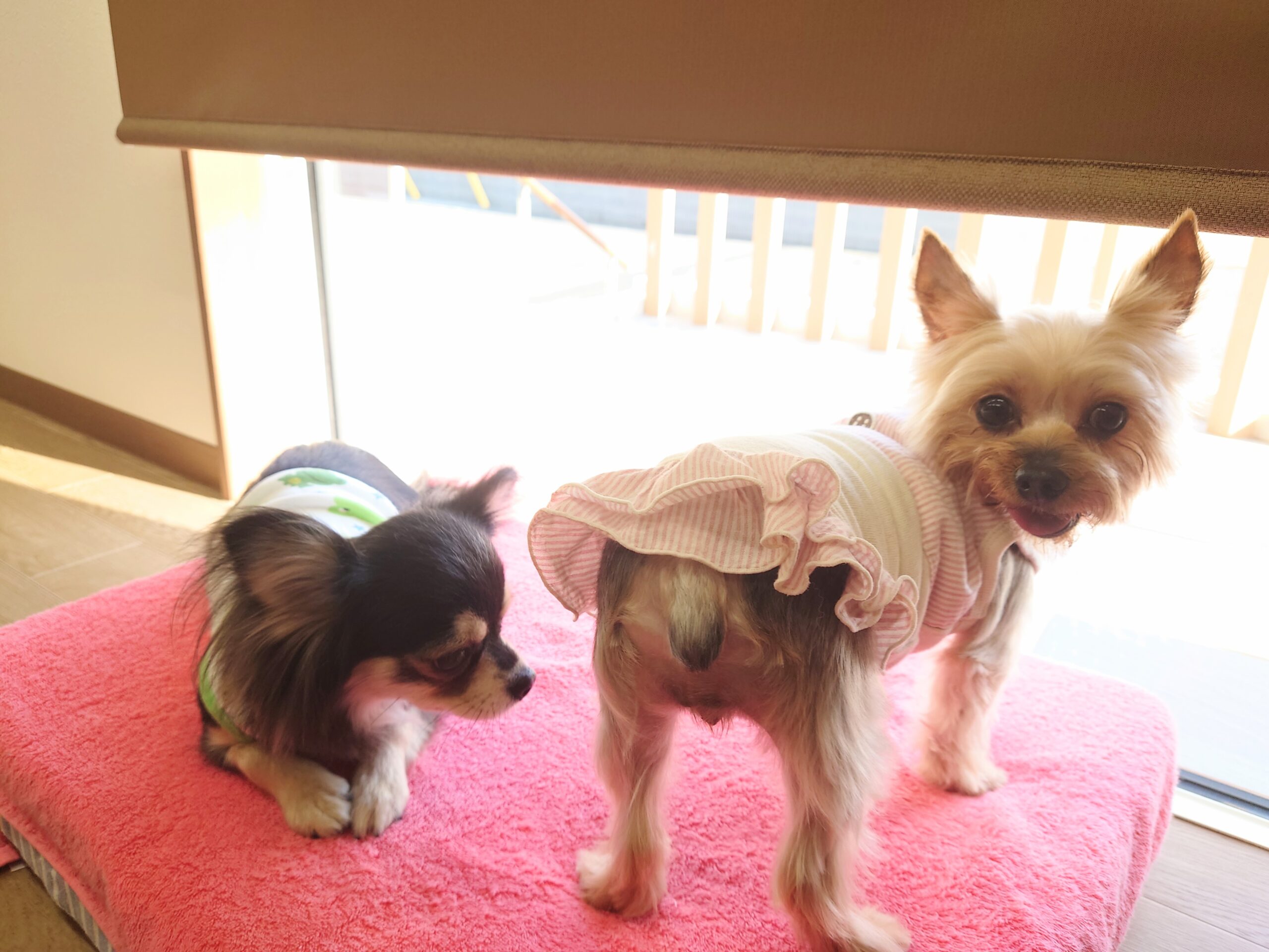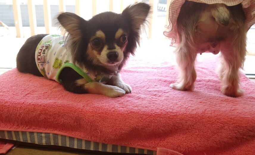 リタイヤ犬のめめちゃんとくるんちゃん。