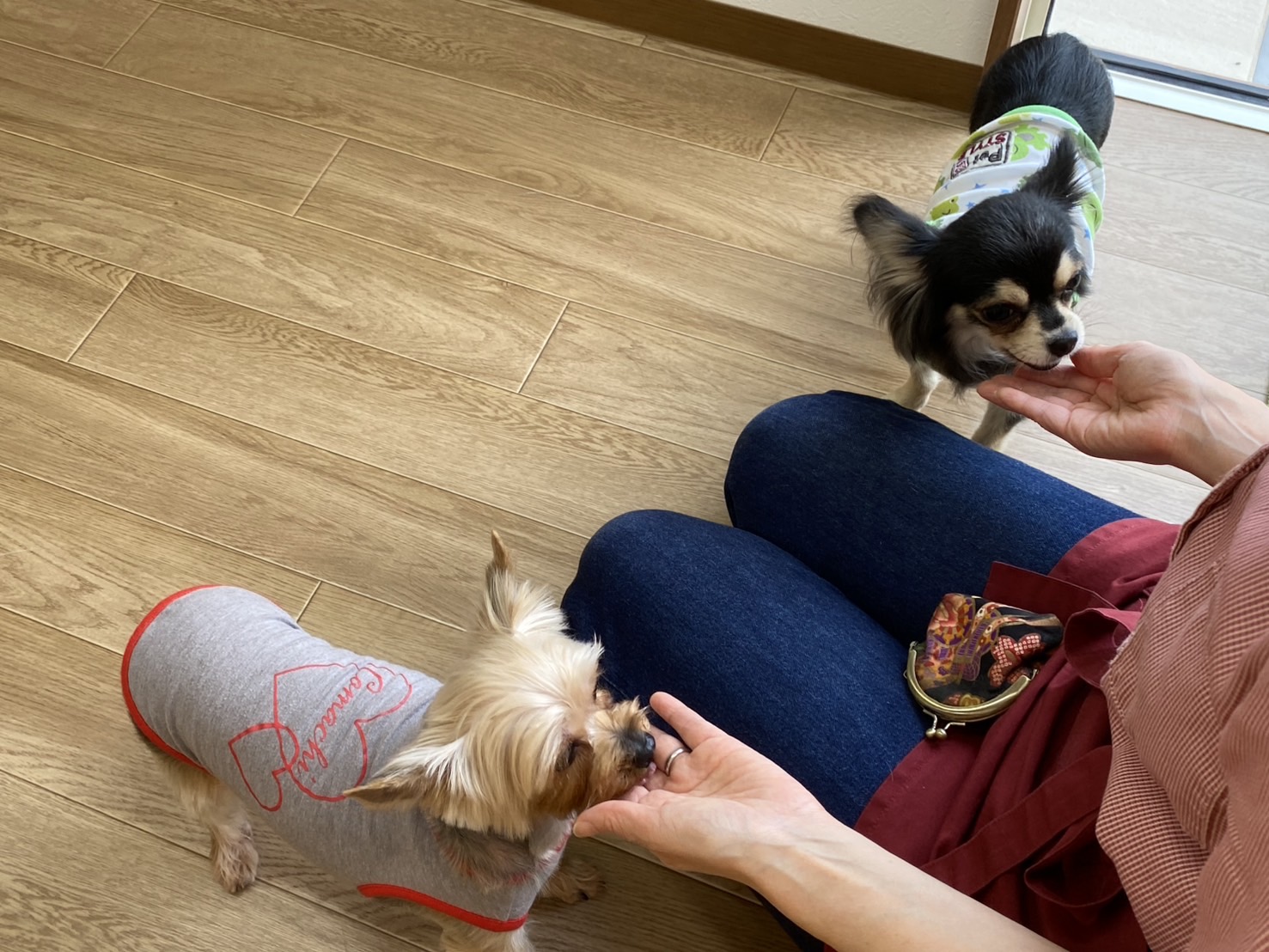 手からご褒美を食べられないめめちゃんには、「おいで!」って言って目の前の床にご褒美を置いてあげます。