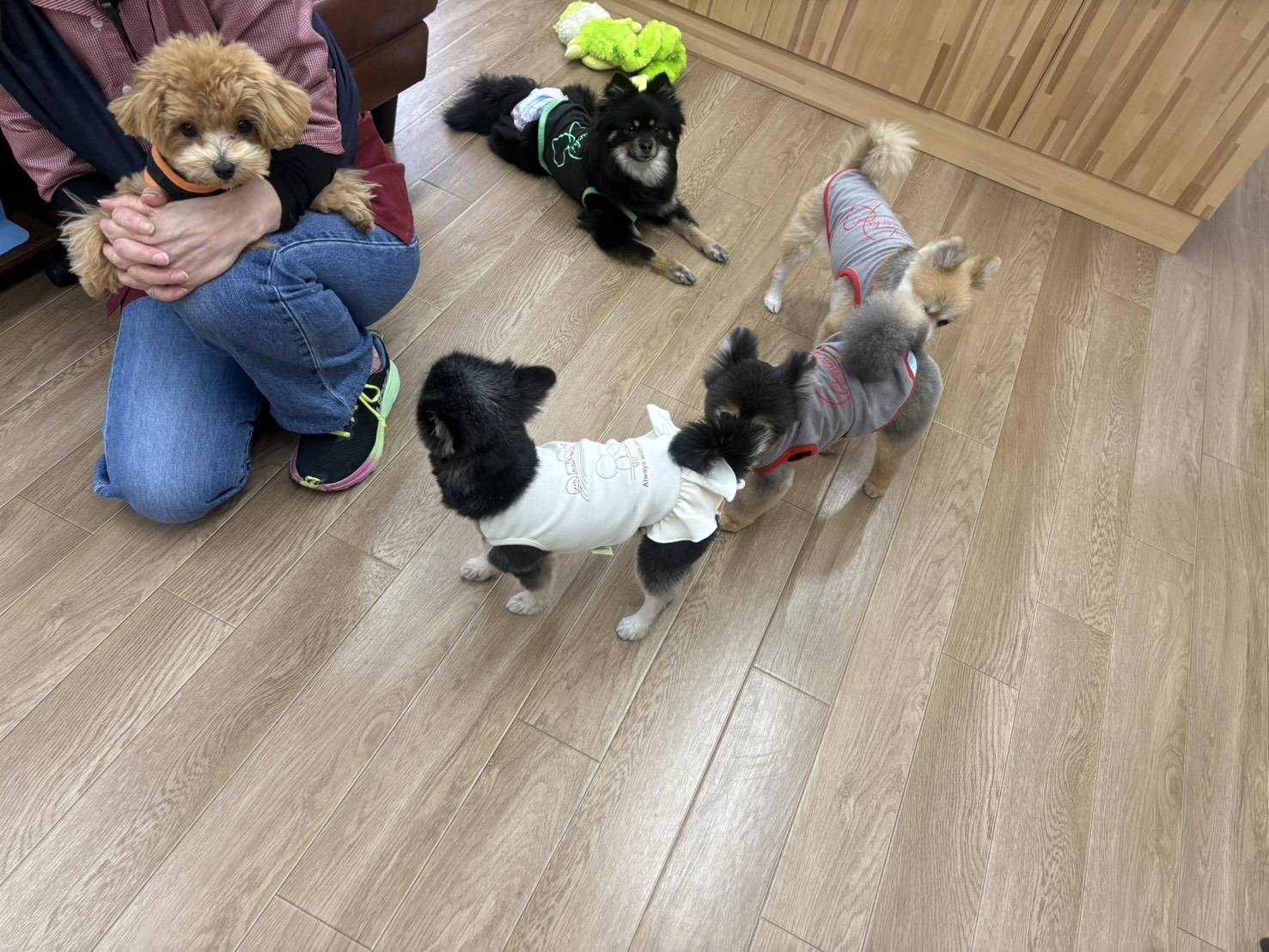 ミオちゃん、テオくん、ひかるちゃん、ジャスミンちゃん、4ワンコ繋がっている(≧▽≦)