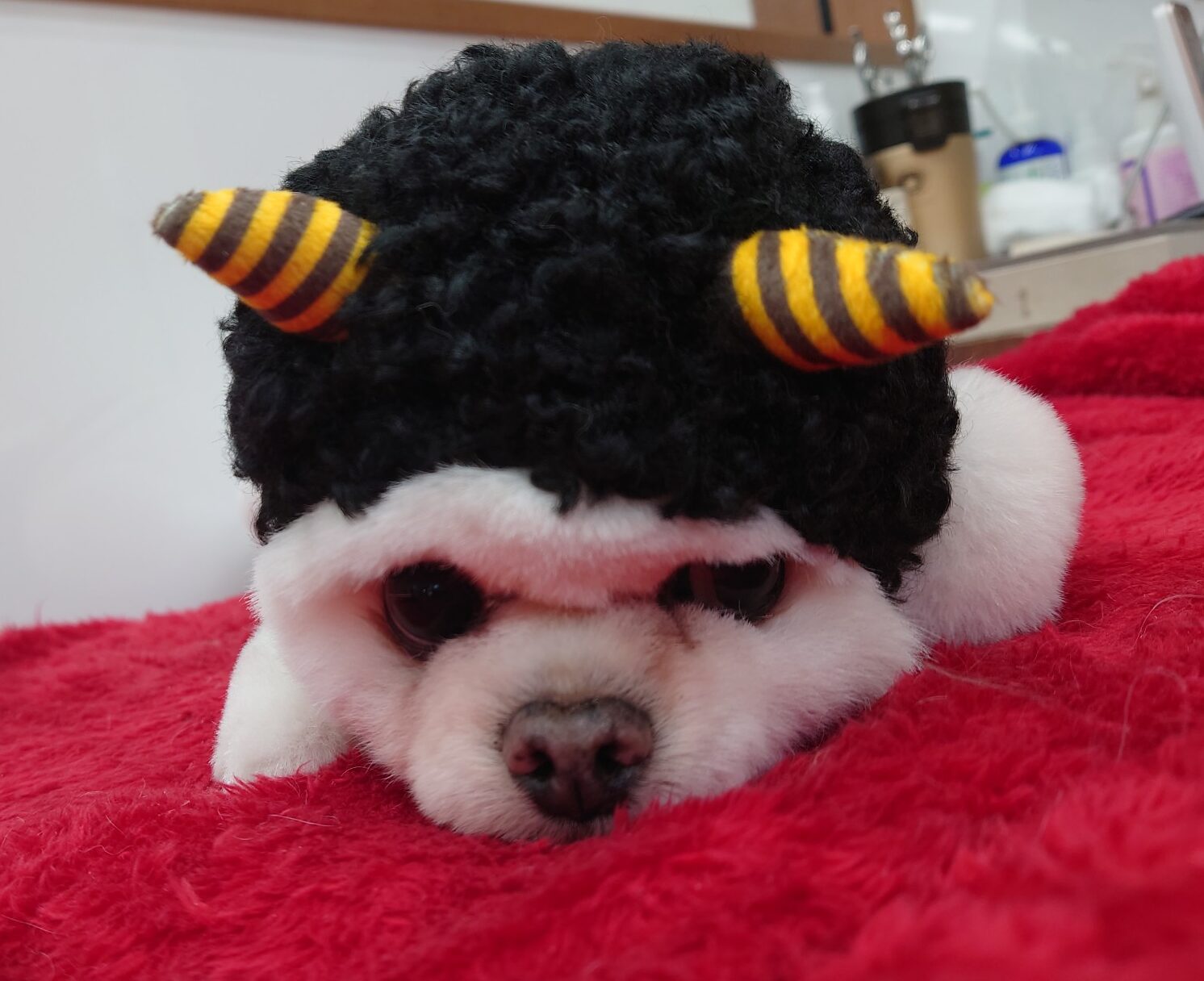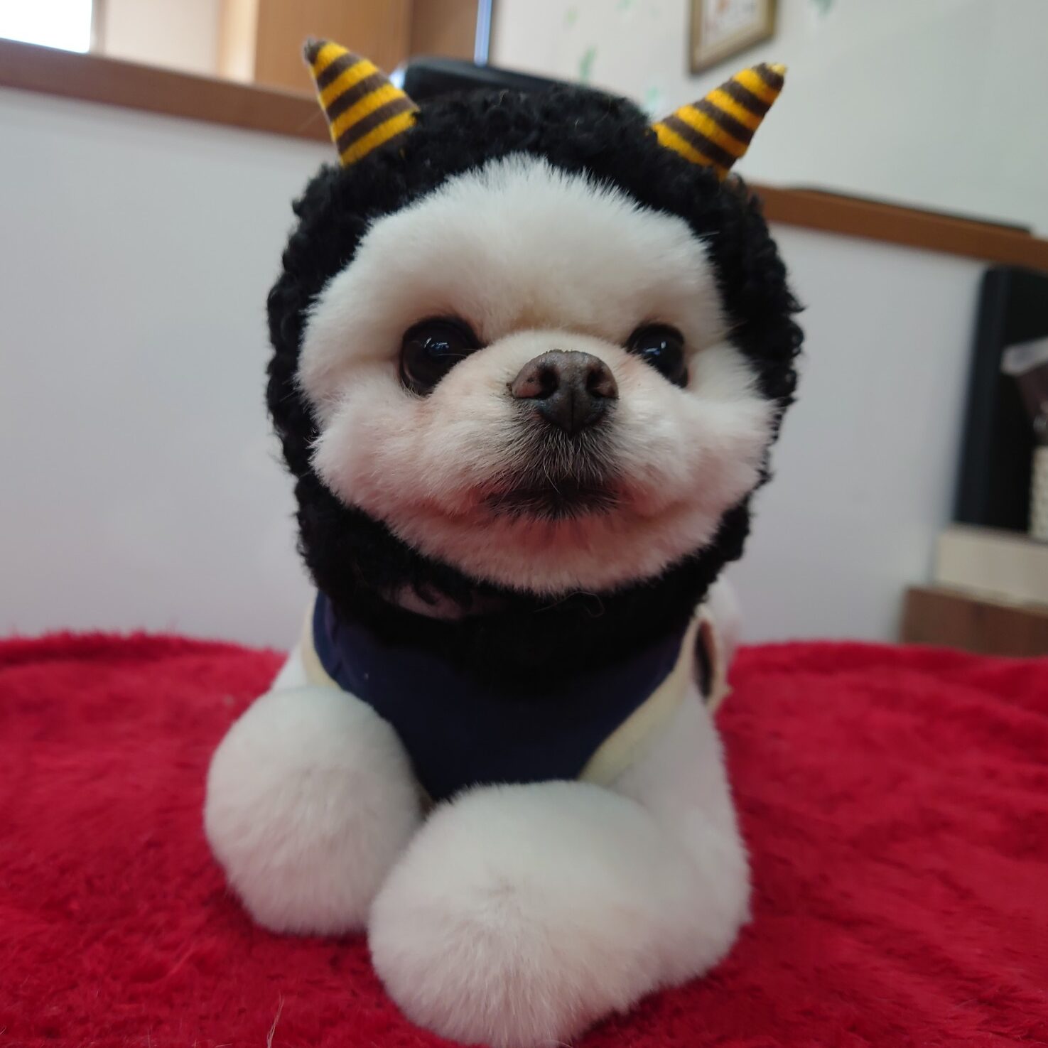 ポメラニアンのニカくん。 コマチ出身のリタイヤ犬です。 いつもトリミング&炭酸泉&オゾンシャワー&マッサージに来てくれます。 節分バージョンの準備中、すでに可愛い💛(≧▽≦)💛