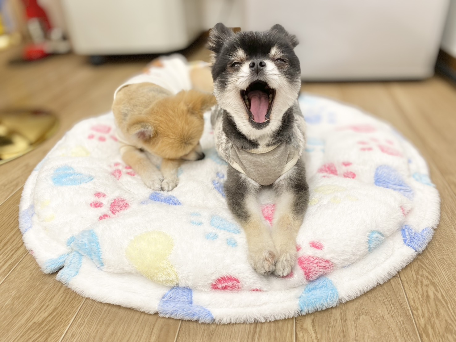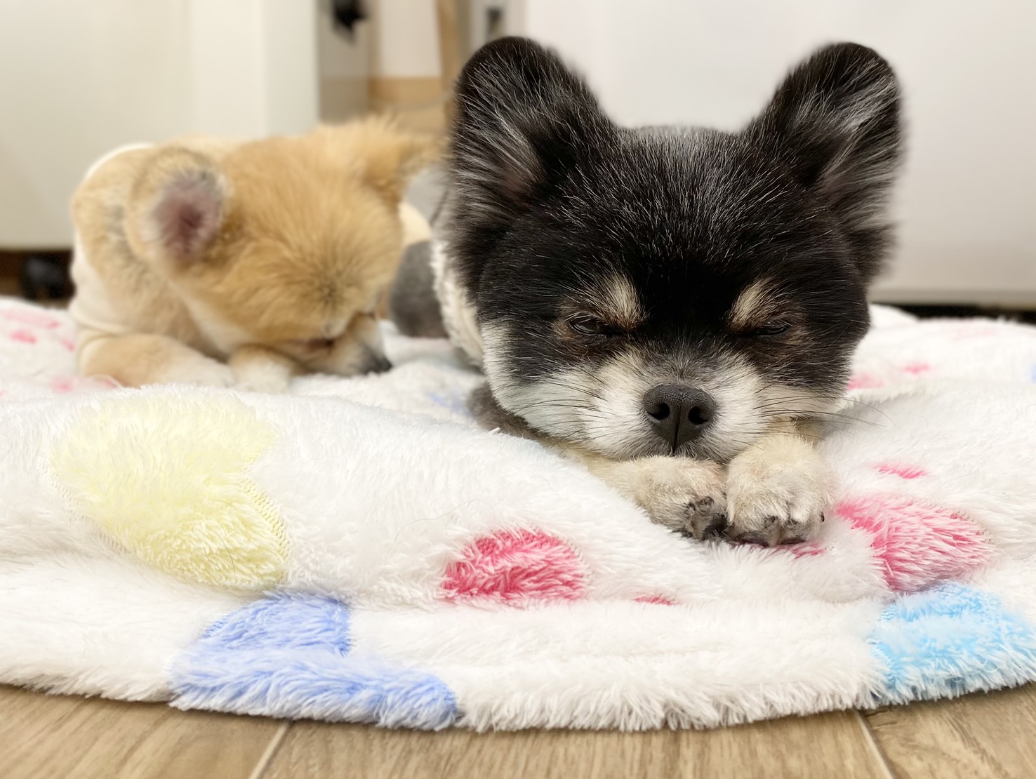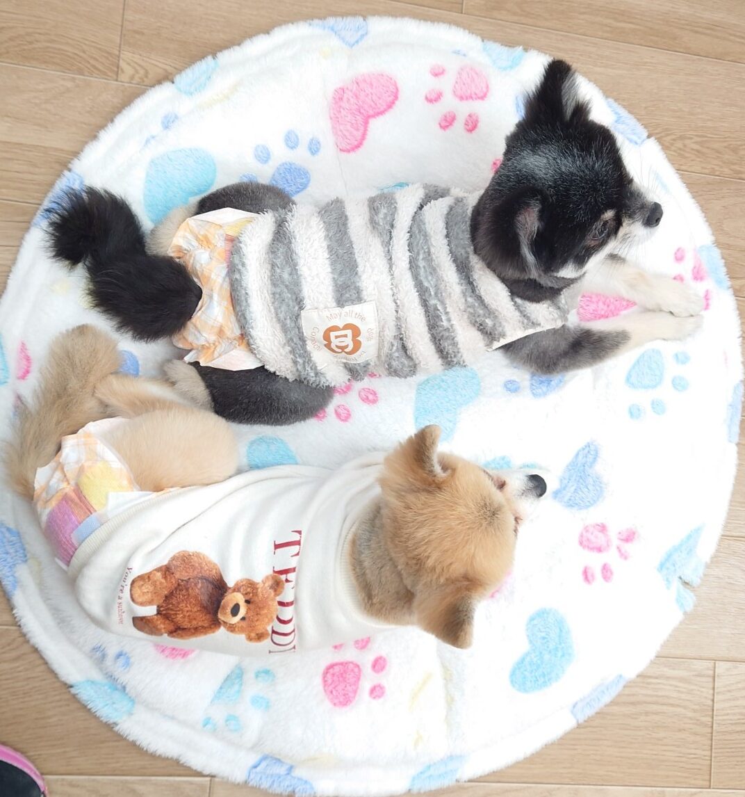 リタイヤ犬のひかるちゃんとミオちゃん。 珍しく、同じベッドで仲良く一緒にくつろいでました🎵🎵